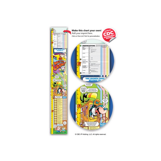 Updated to reflect CDC vaccine schedule. Reminds parents that children need early and ongoing health care. Features an immunization schedule (CDC standard), with space to record the dates children received their shots; age-specific safety, health, and child-development tips; average heights for children ages 1 through 12; and boxes in which to note the dates of vision, hearing, and well-child checkups. "Yardstick" along the side measures growth up to 5 1/2 feet. 8 5/8" wide x 56" high. For families with children ages birth-12.